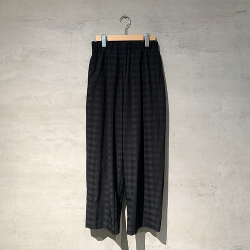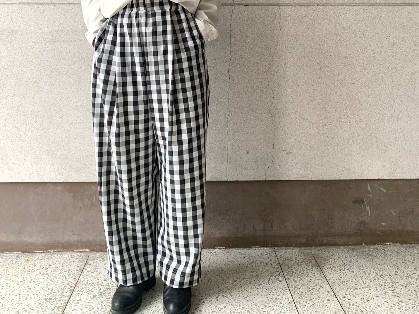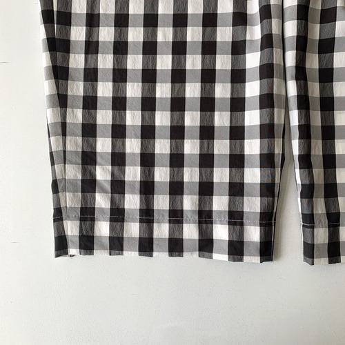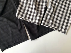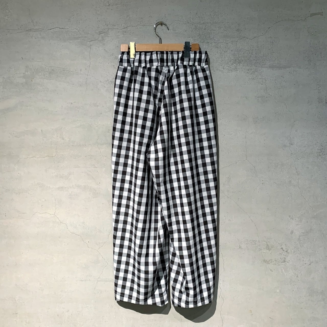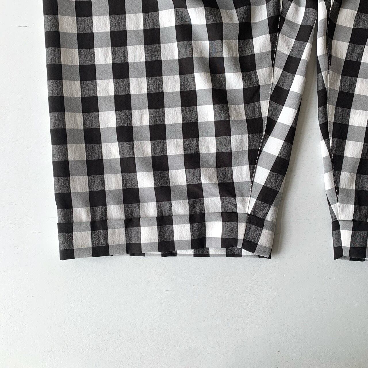 75Dの透けにくいポリエステル糸をタテ糸ヨコ糸に配した平織ブロックチェック生地を使用したパンツ。