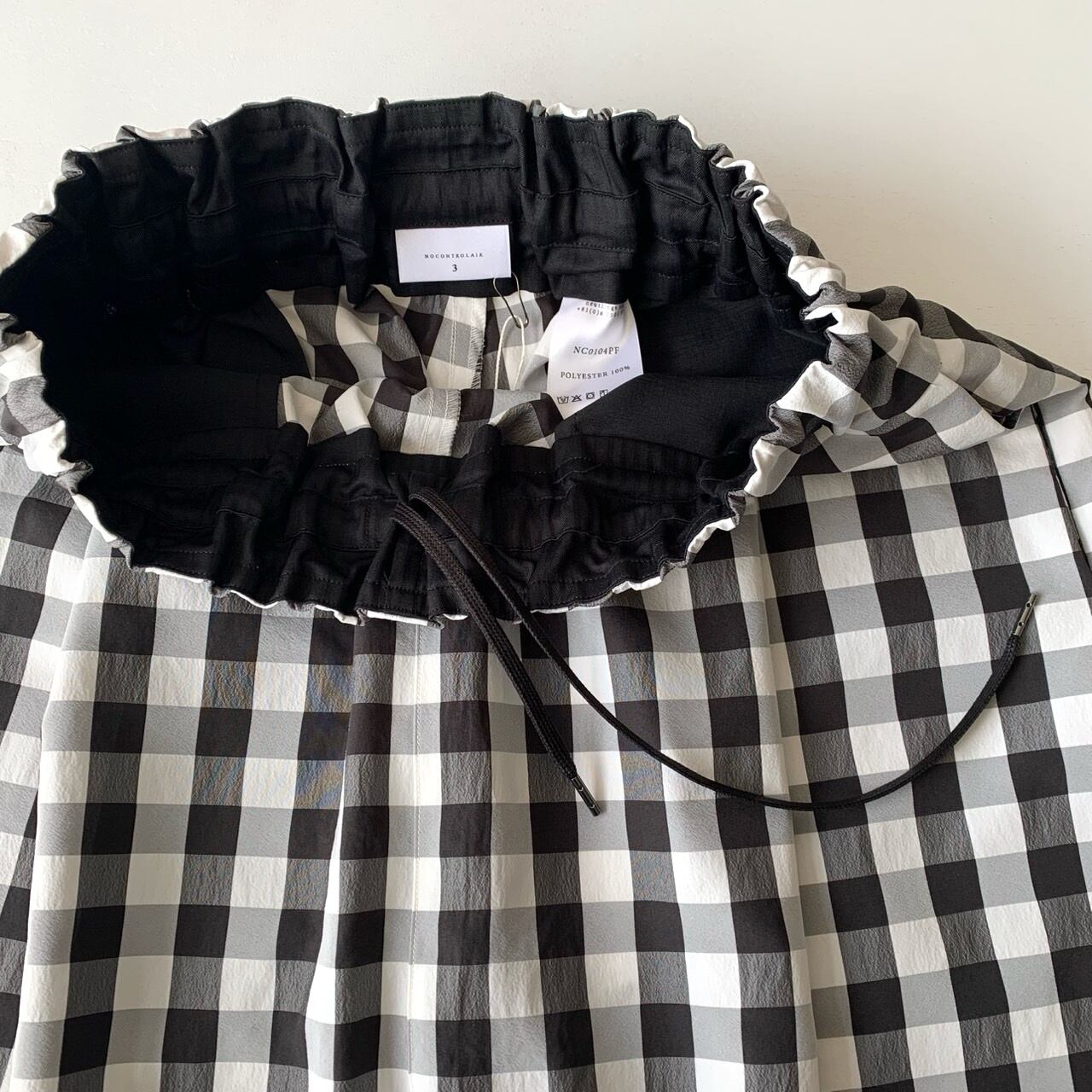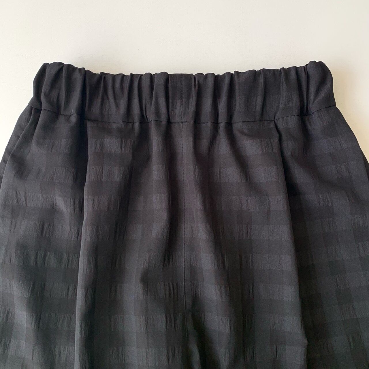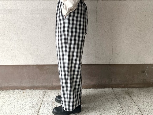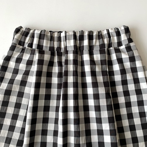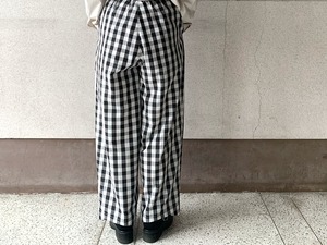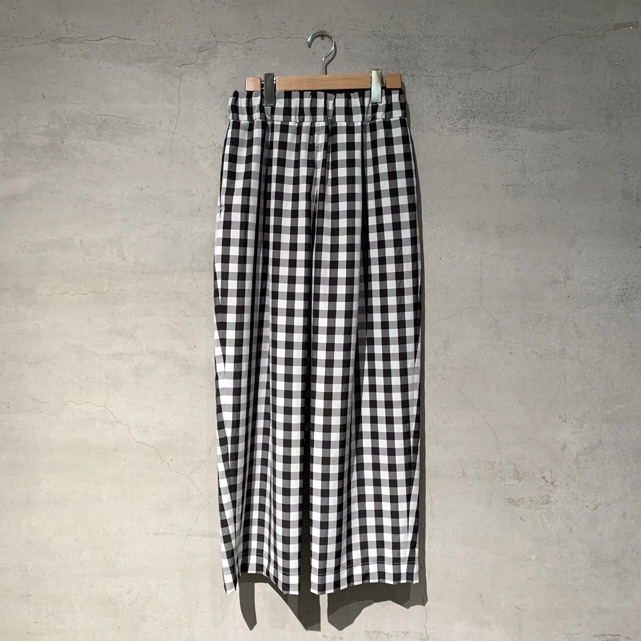 75Dの透けにくいポリエステル糸をタテ糸ヨコ糸に配した平織ブロックチェック生地を使用したパンツ。