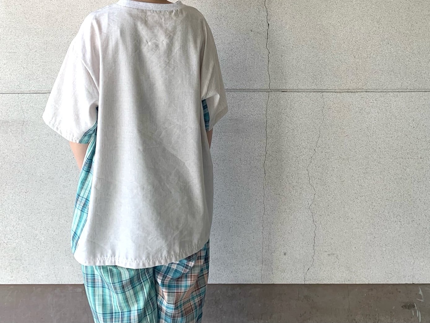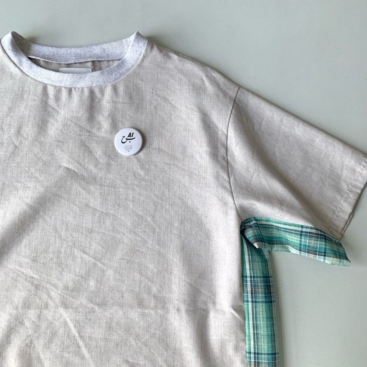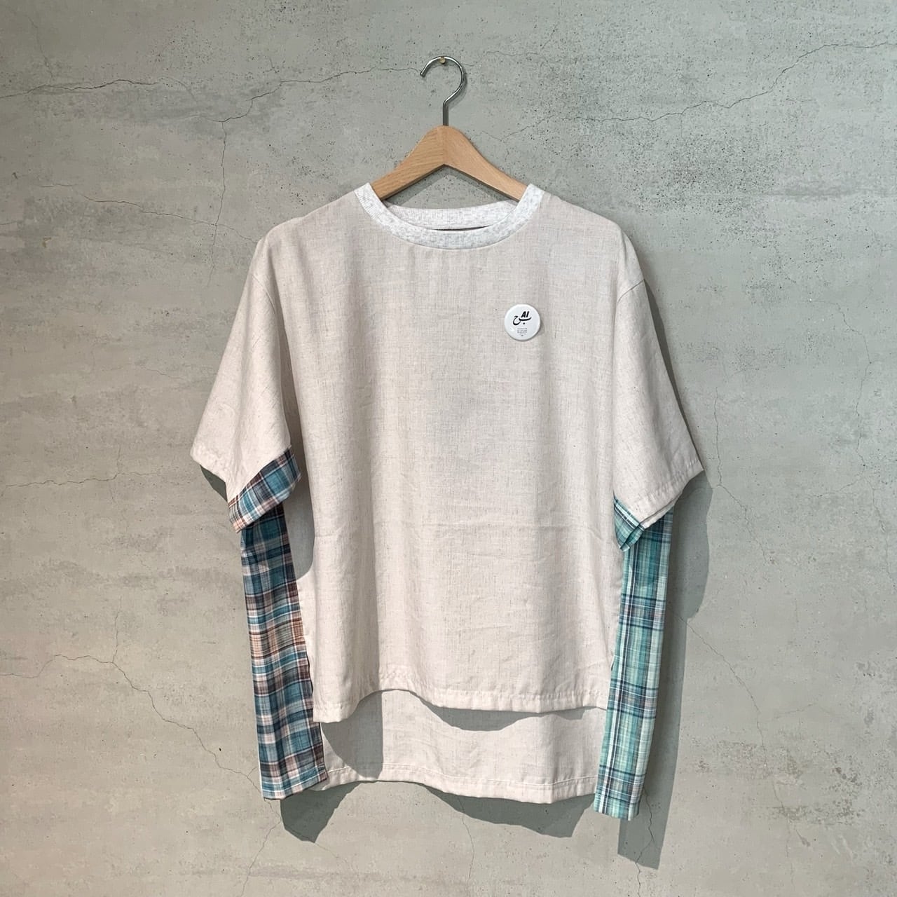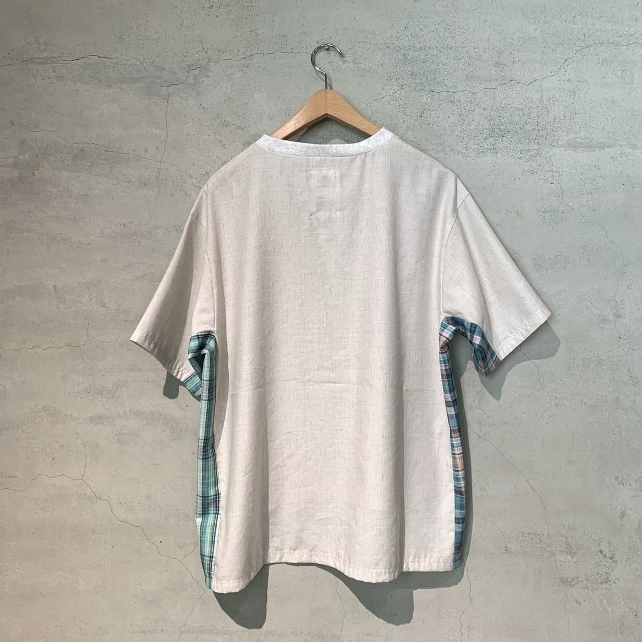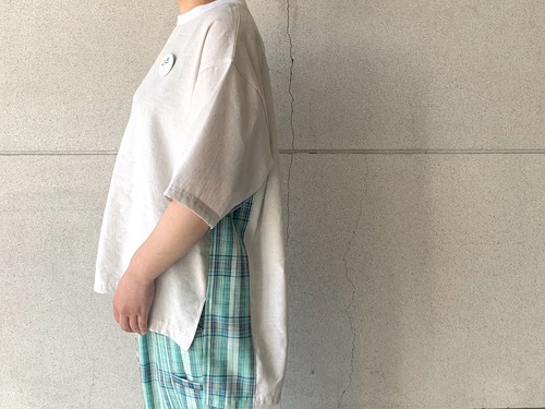 麻混のCOOLMAX® 素材で仕立てたオーバーサイズの布帛Tシャツ、両脇にアクリルペイントで描き上げたオリジナルのチェックと日々の画像収集から産まれたグリッチ総柄、2種類のオリジナルプリントファブリックを使用。布帛ならではのサラッとした着心地とTシャツの気軽さを兼ね備えたいいとこ取りの一品。バッジ付き。