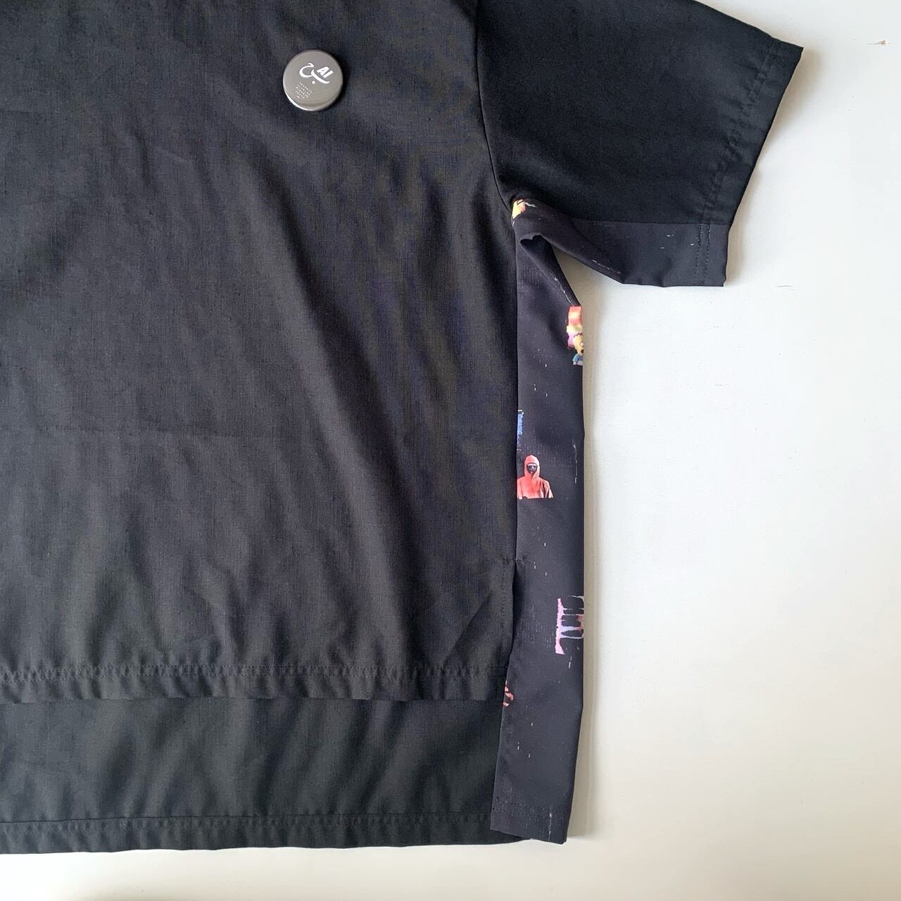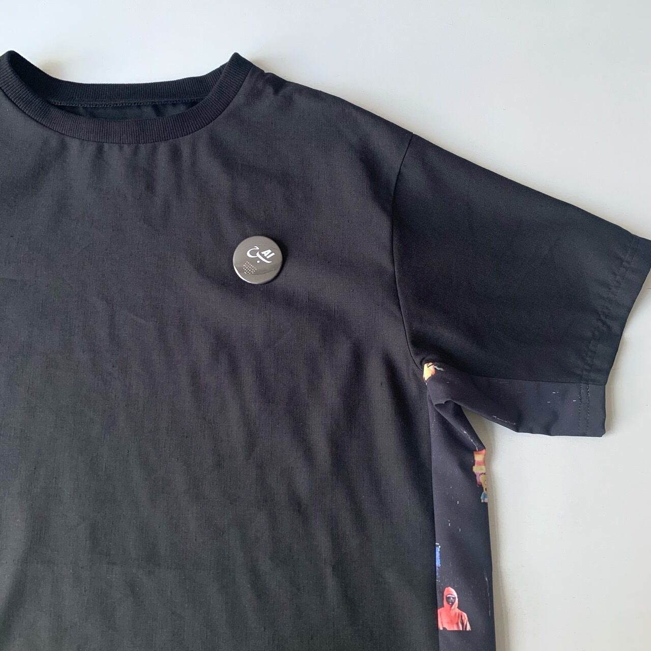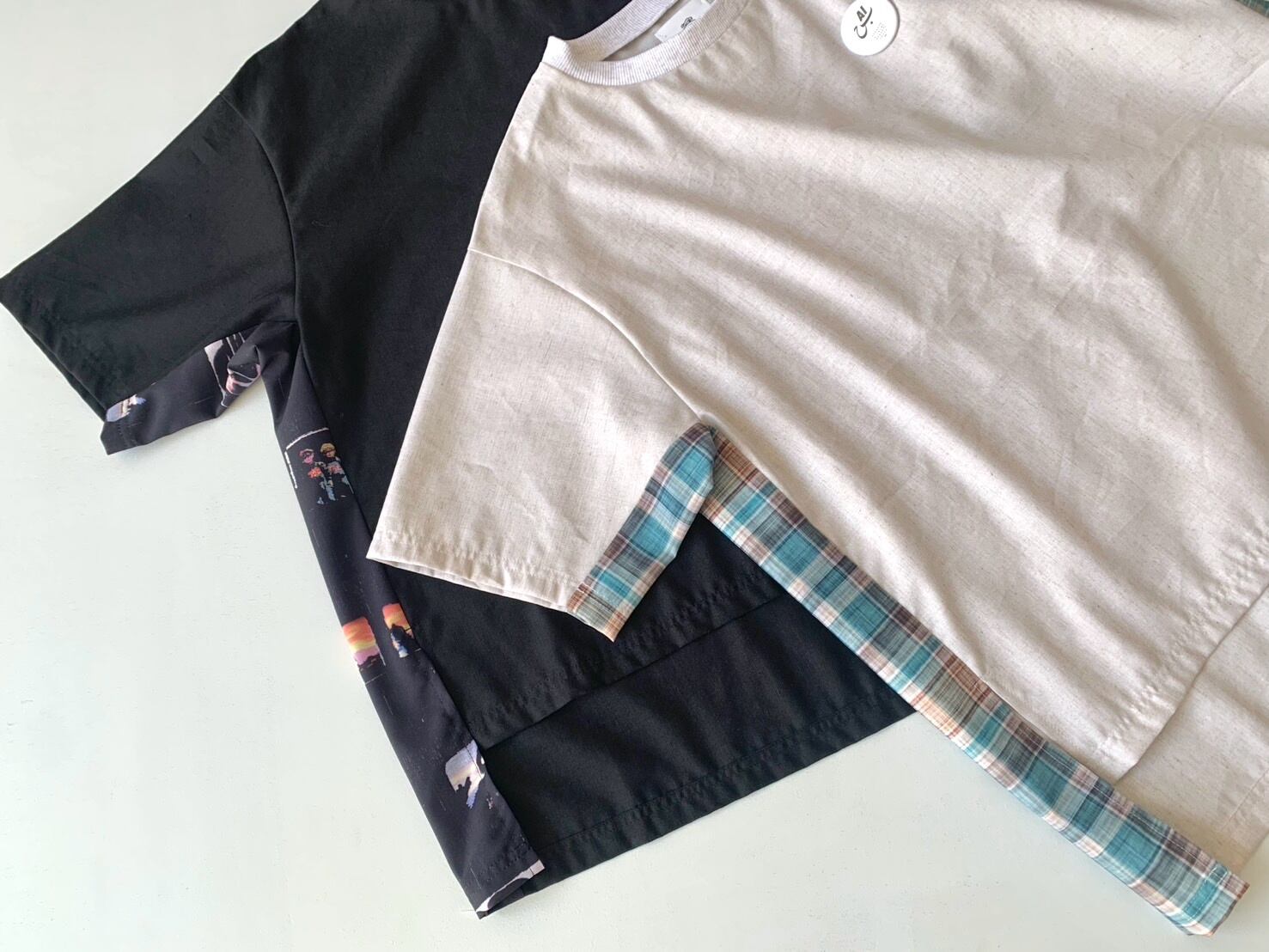 麻混のCOOLMAX® 素材で仕立てたオーバーサイズの布帛Tシャツ、両脇にアクリルペイントで描き上げたオリジナルのチェックと日々の画像収集から産まれたグリッチ総柄、2種類のオリジナルプリントファブリックを使用。布帛ならではのサラッとした着心地とTシャツの気軽さを兼ね備えたいいとこ取りの一品。バッジ付き。