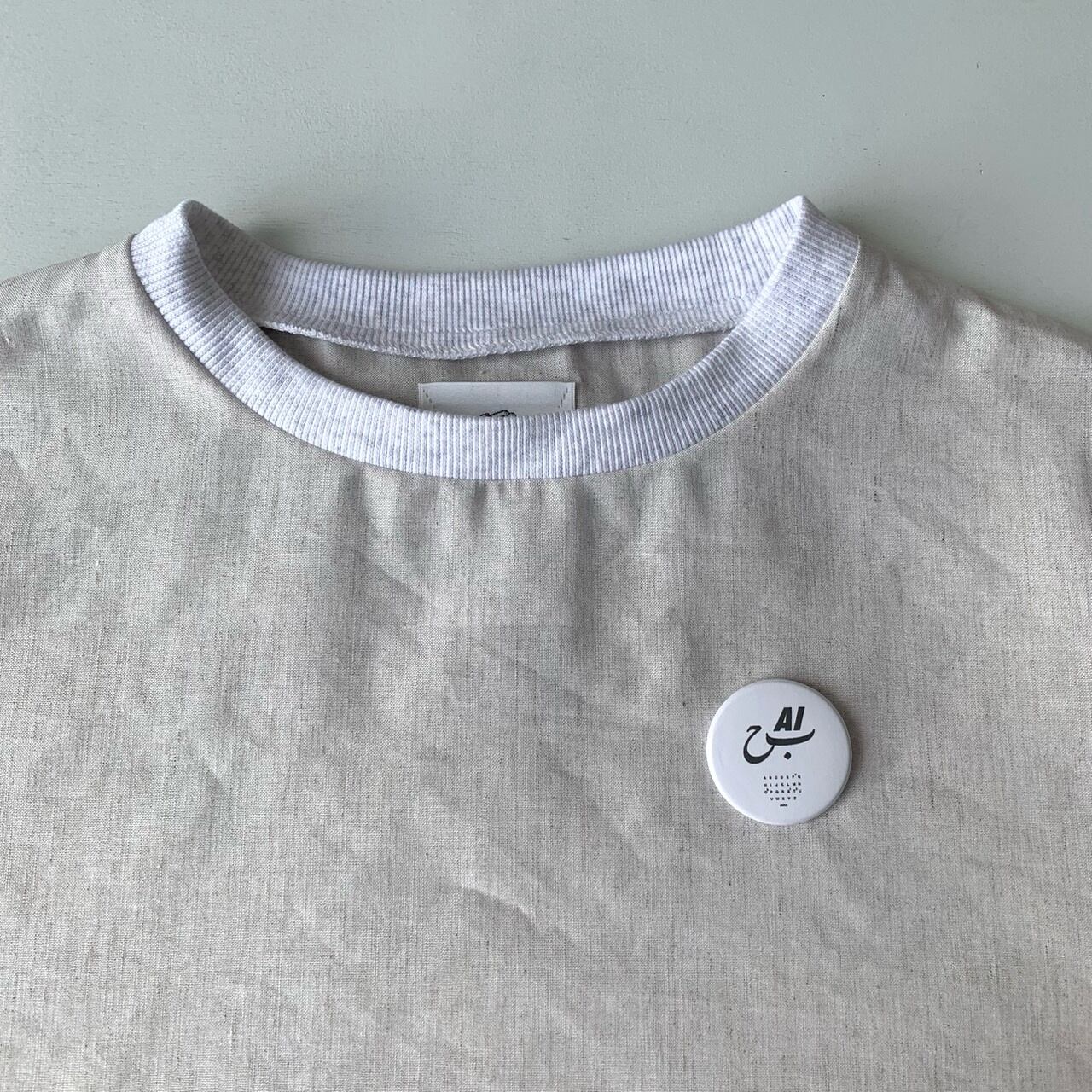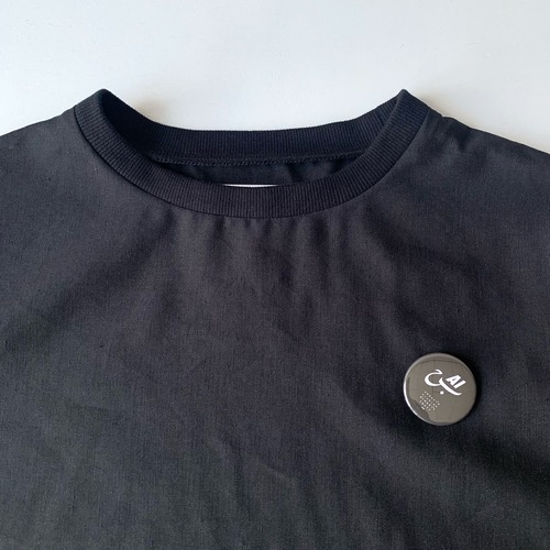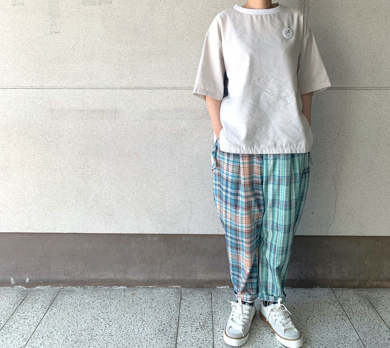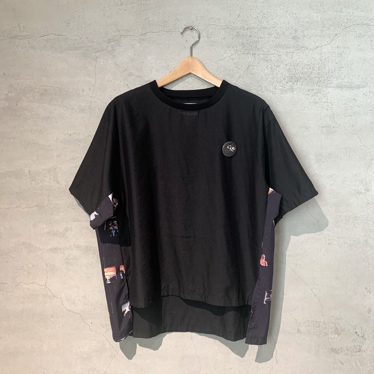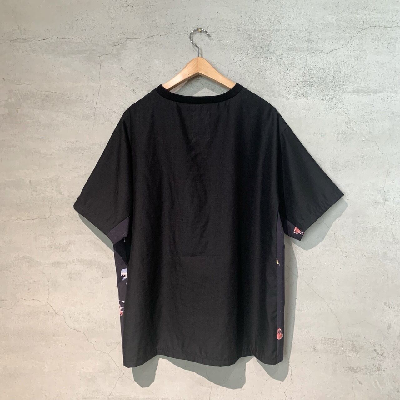 麻混のCOOLMAX® 素材で仕立てたオーバーサイズの布帛Tシャツ、両脇にアクリルペイントで描き上げたオリジナルのチェックと日々の画像収集から産まれたグリッチ総柄、2種類のオリジナルプリントファブリックを使用。布帛ならではのサラッとした着心地とTシャツの気軽さを兼ね備えたいいとこ取りの一品。バッジ付き。