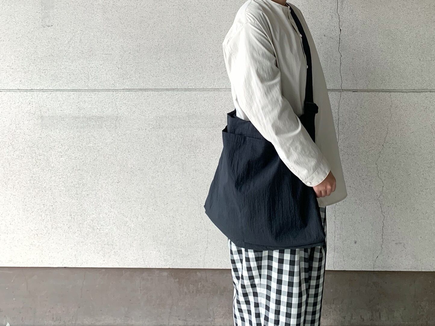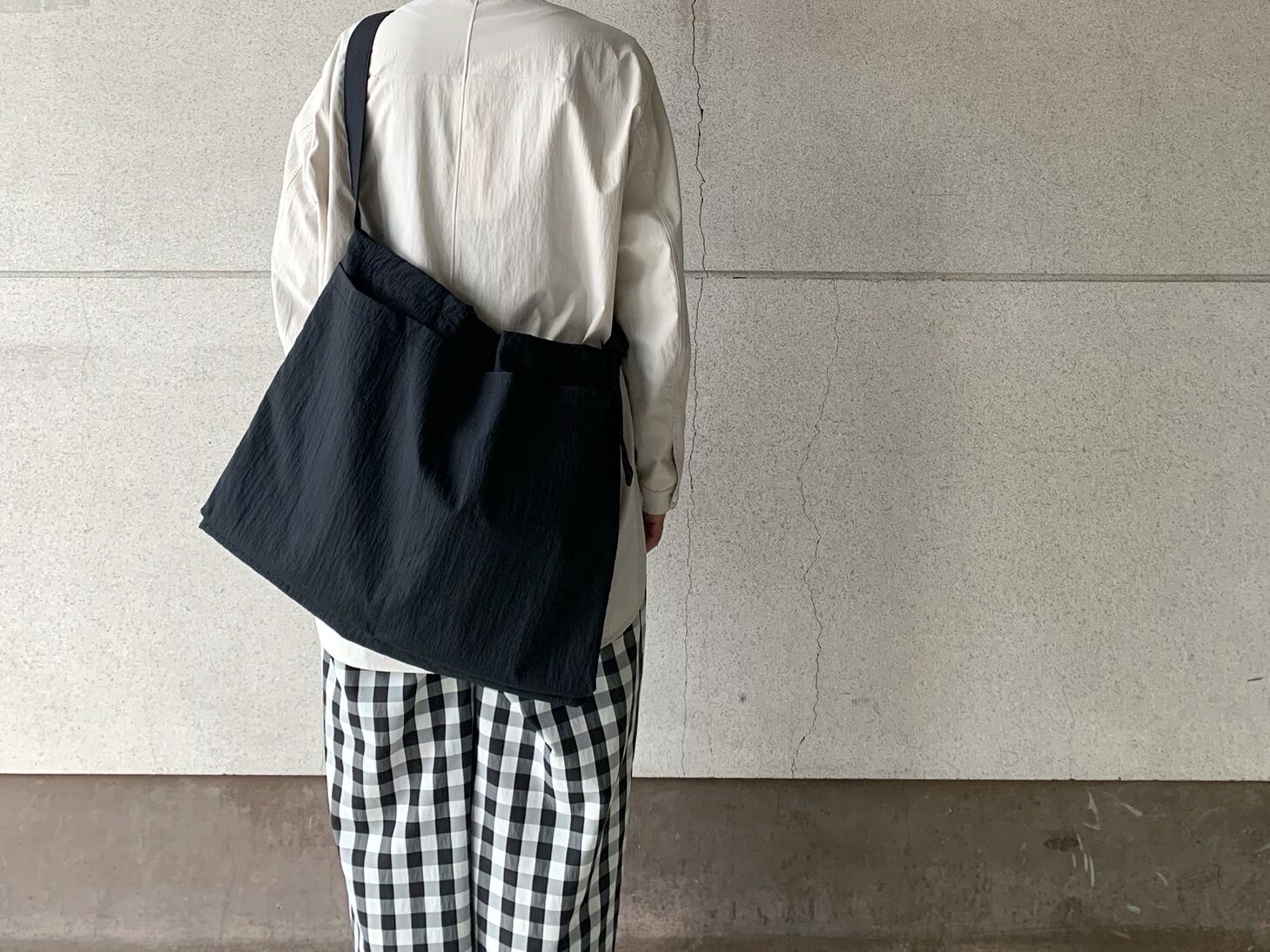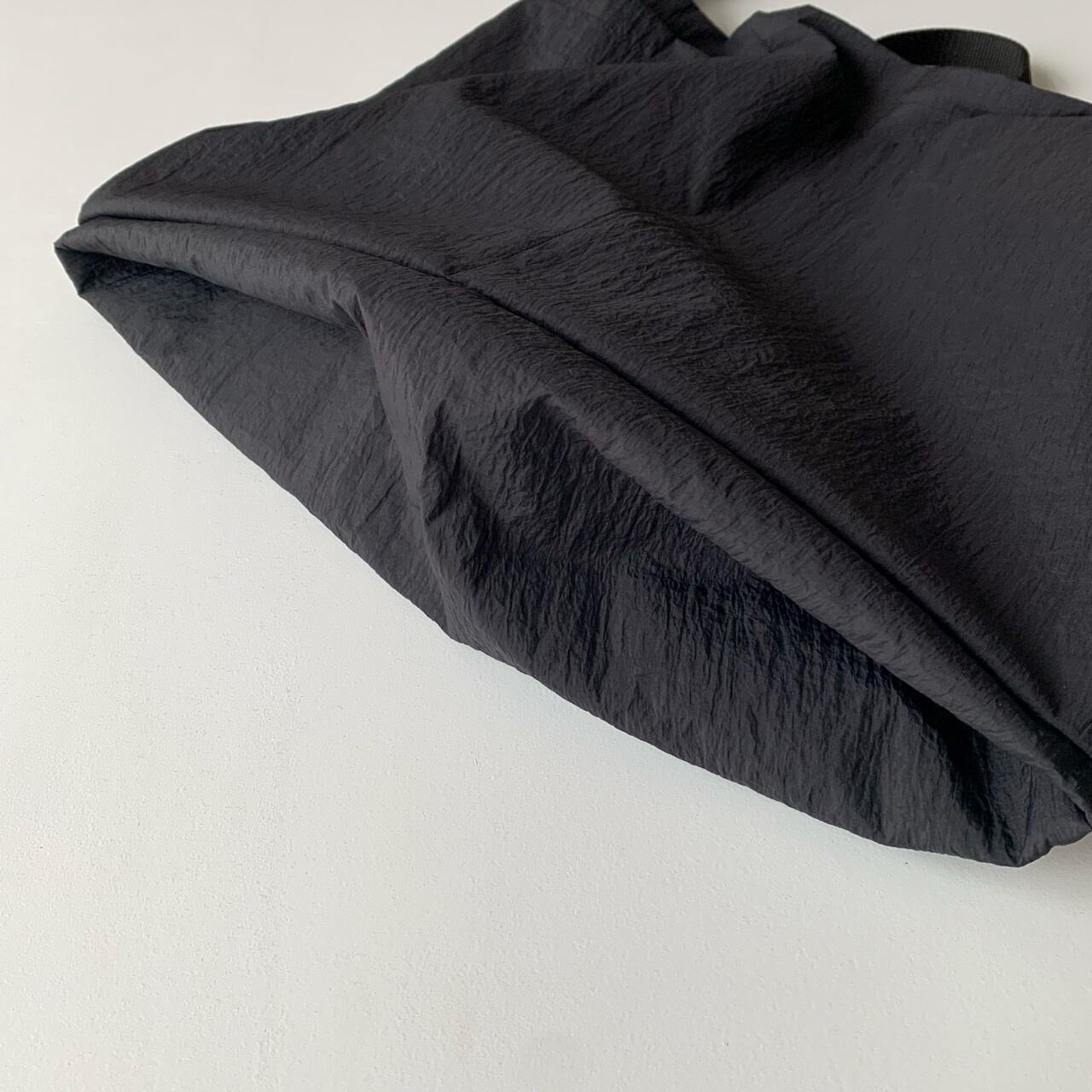 70Dナイロン糸を使った、ハリ感としなやかな風合い、弱撥水性を兼ね揃えたタフタ生地に塩縮加工を施し、シワ感=シュリンク感のあるマットで落ち着いた表情に仕上げています。