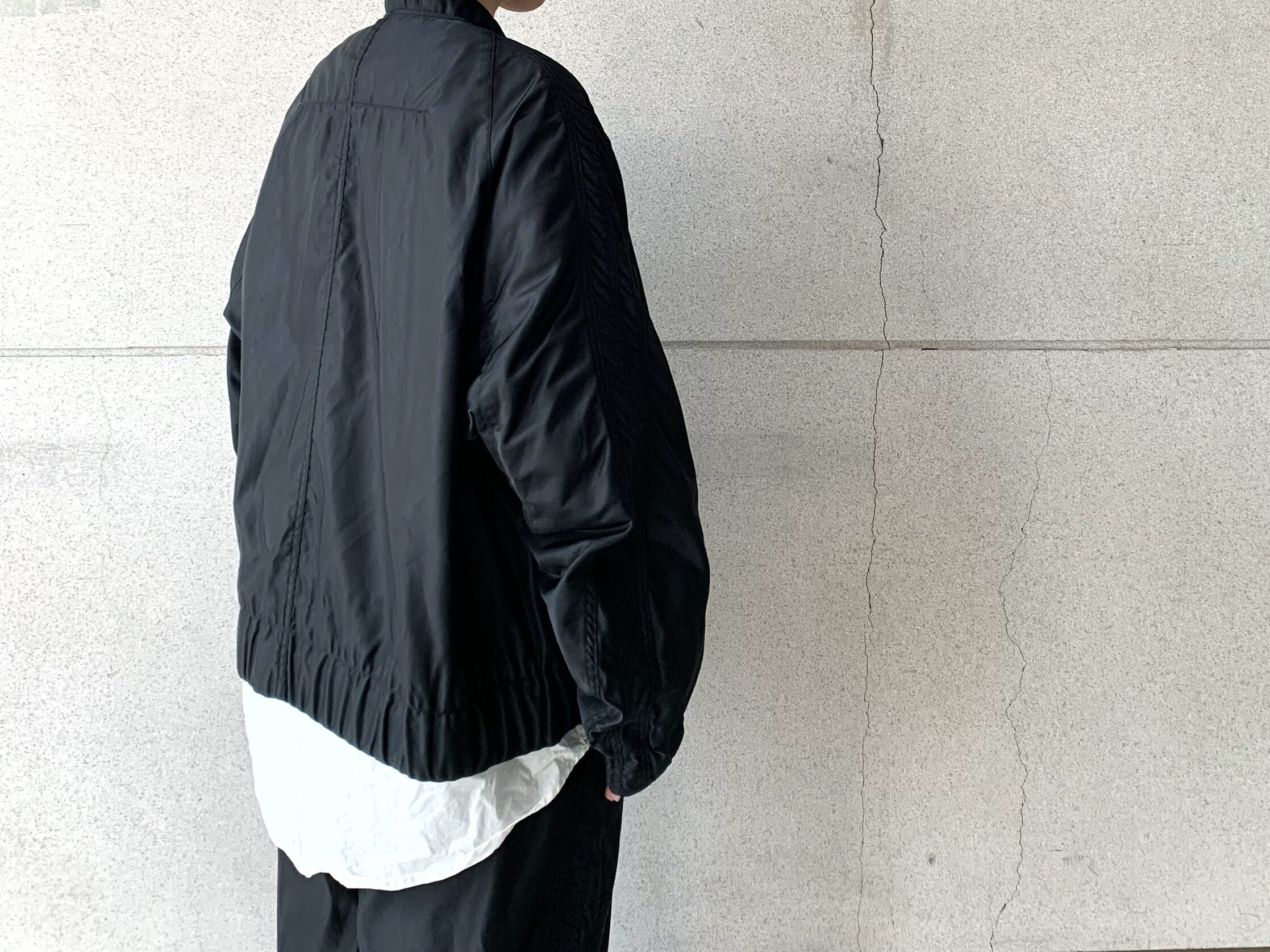 タテ糸方向に13%以上の縮率が出る高密度に織られたナイロンツイル生地を使用したトラックジャケット。