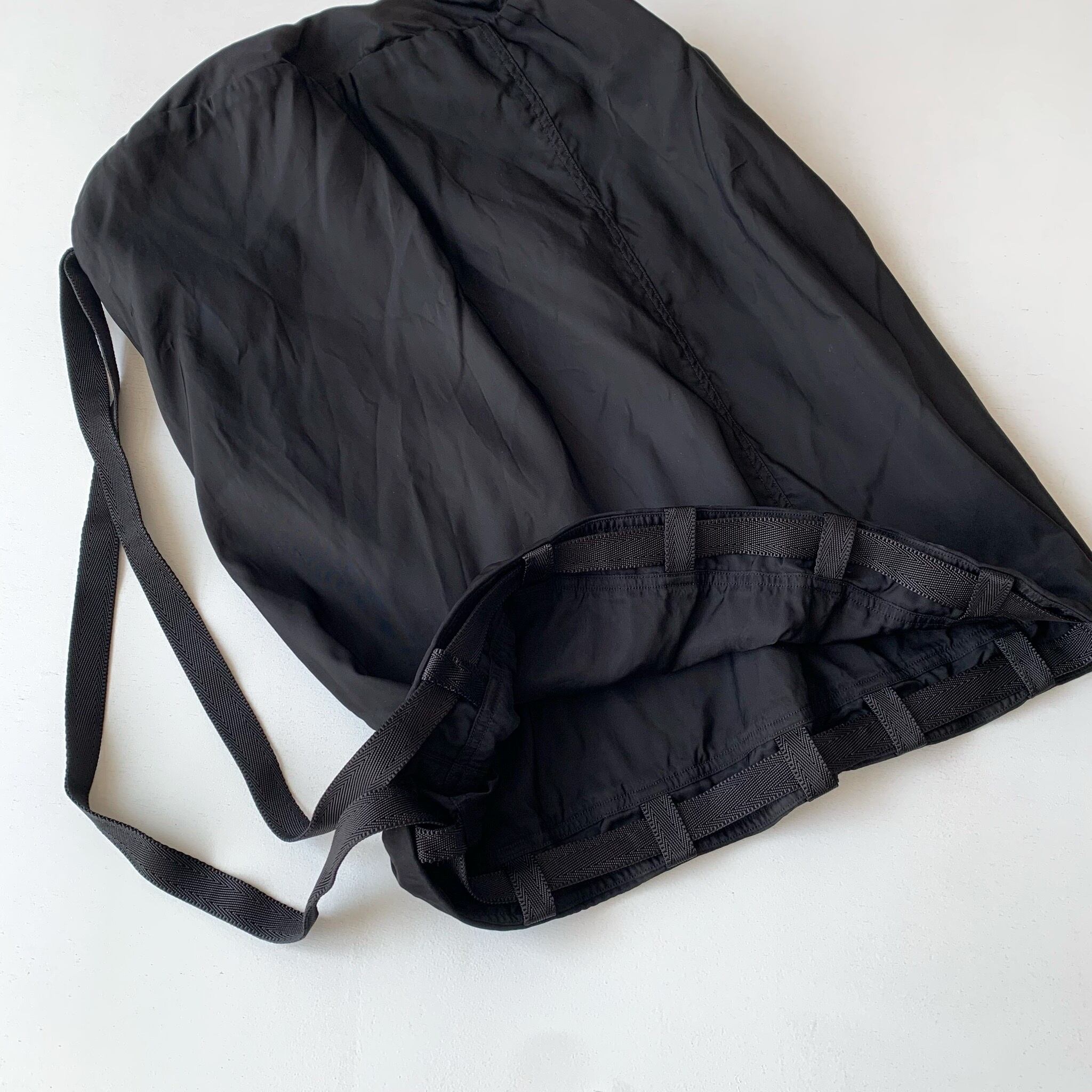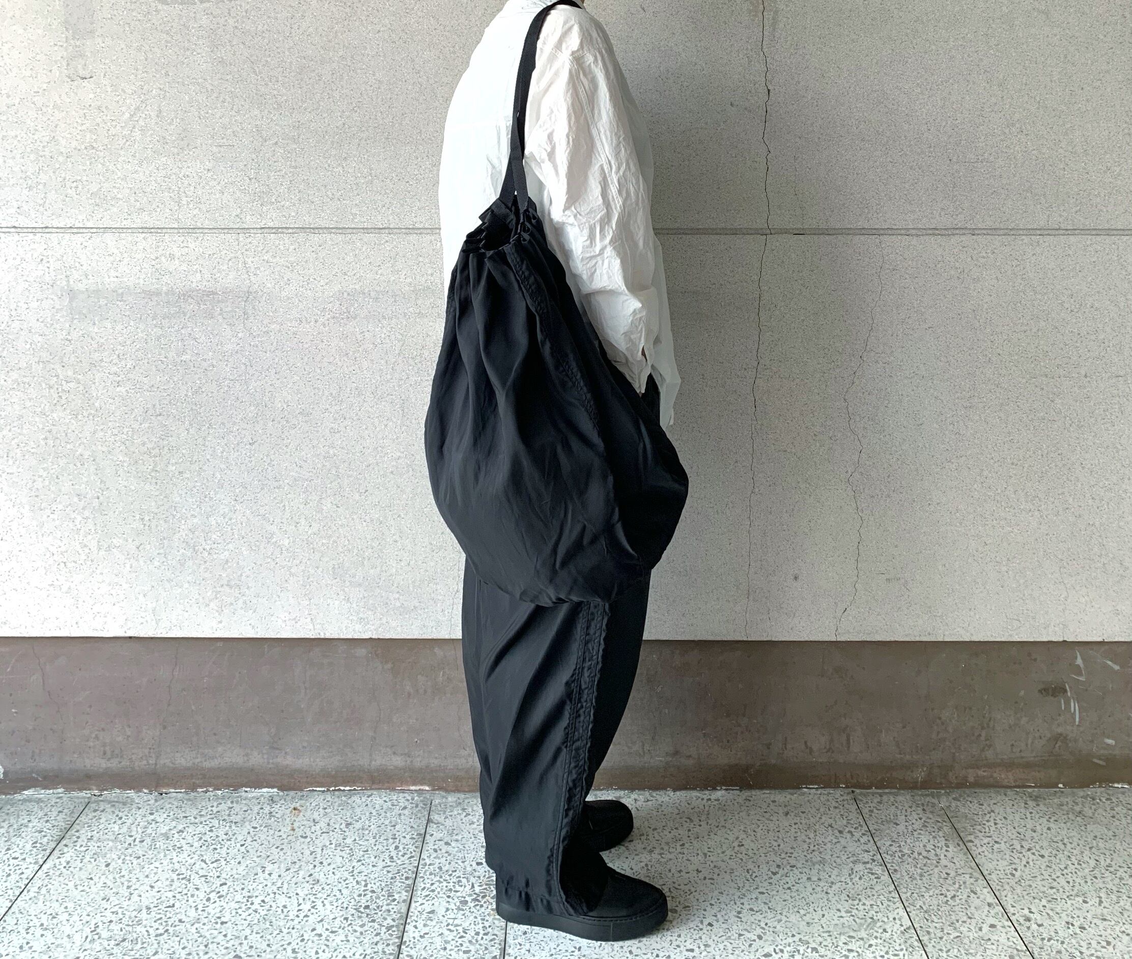 タテ糸方向に13%以上の縮率が出る高密度に織られたナイロンツイル生地を使用した巾着バッグ。