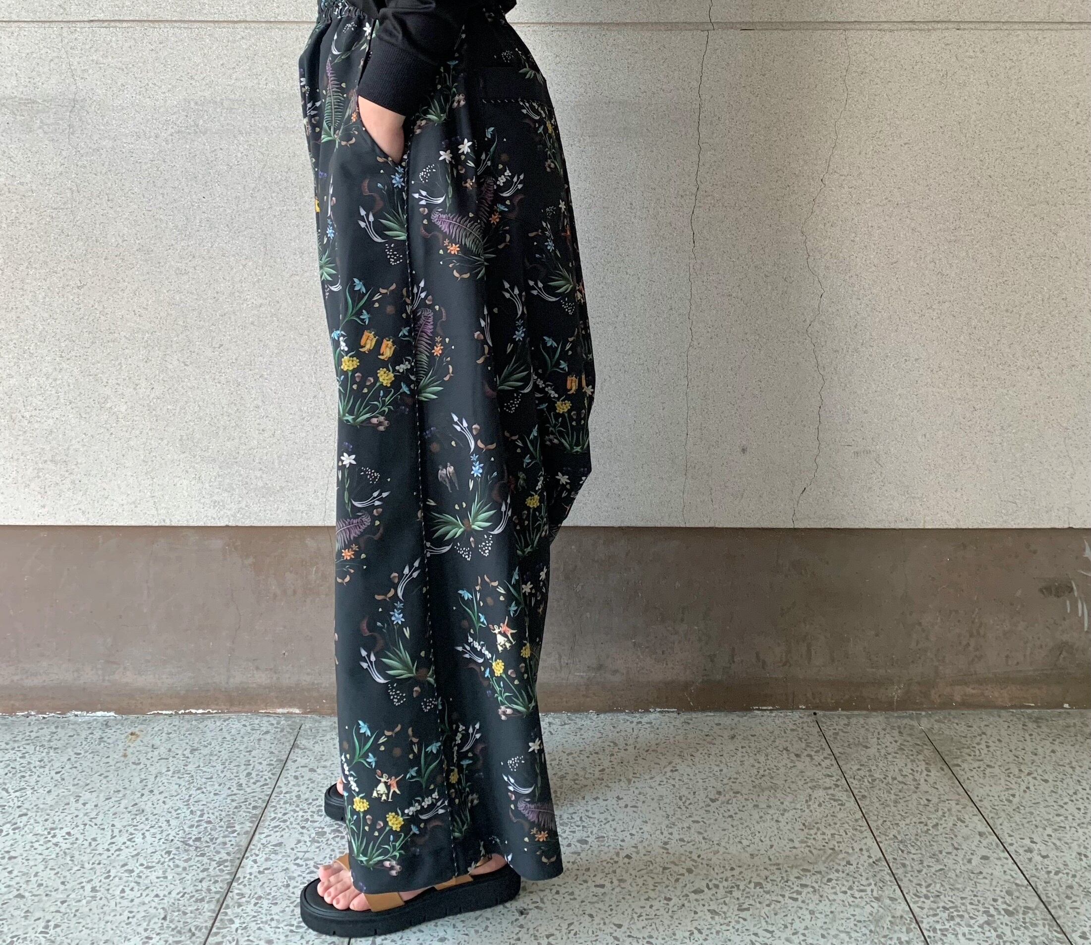 古今東西のダンスの名シーンを集結させたオリジナルのテキスタイルが魅力的なリラックスワイドパンツ。