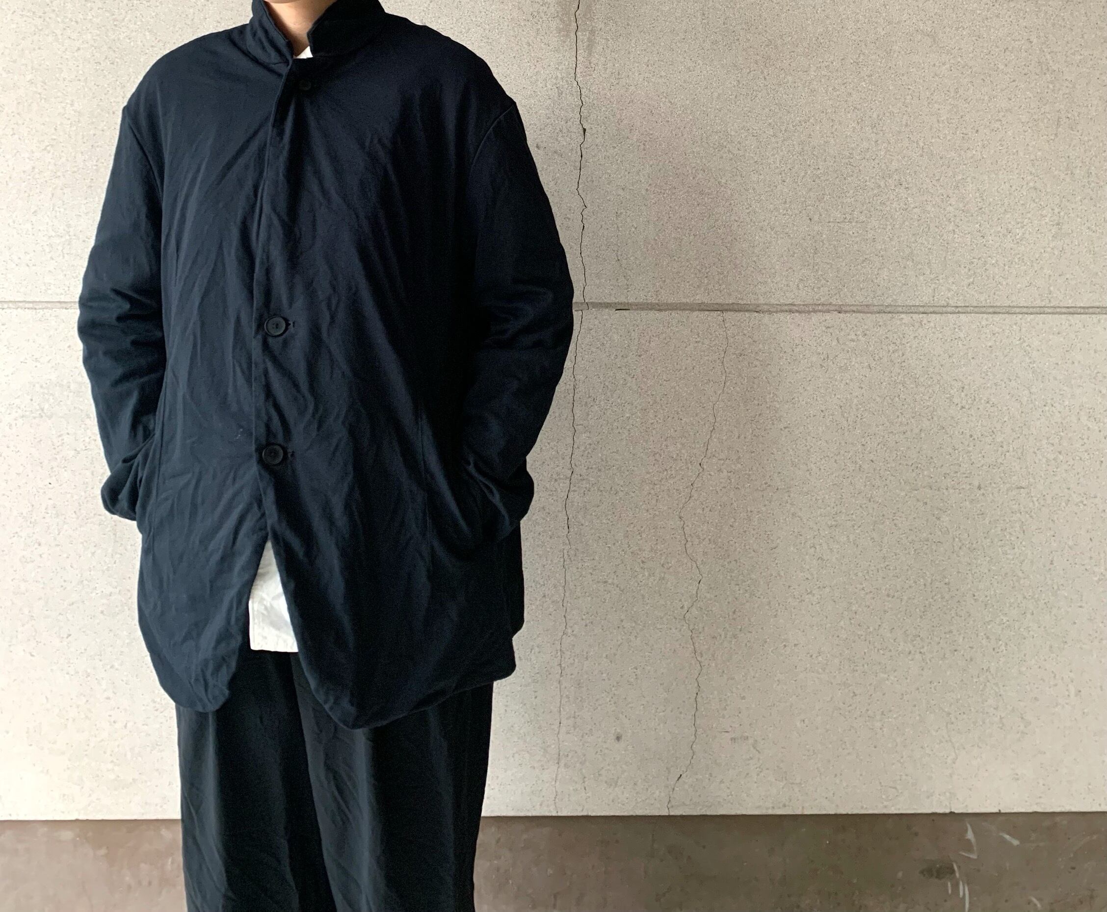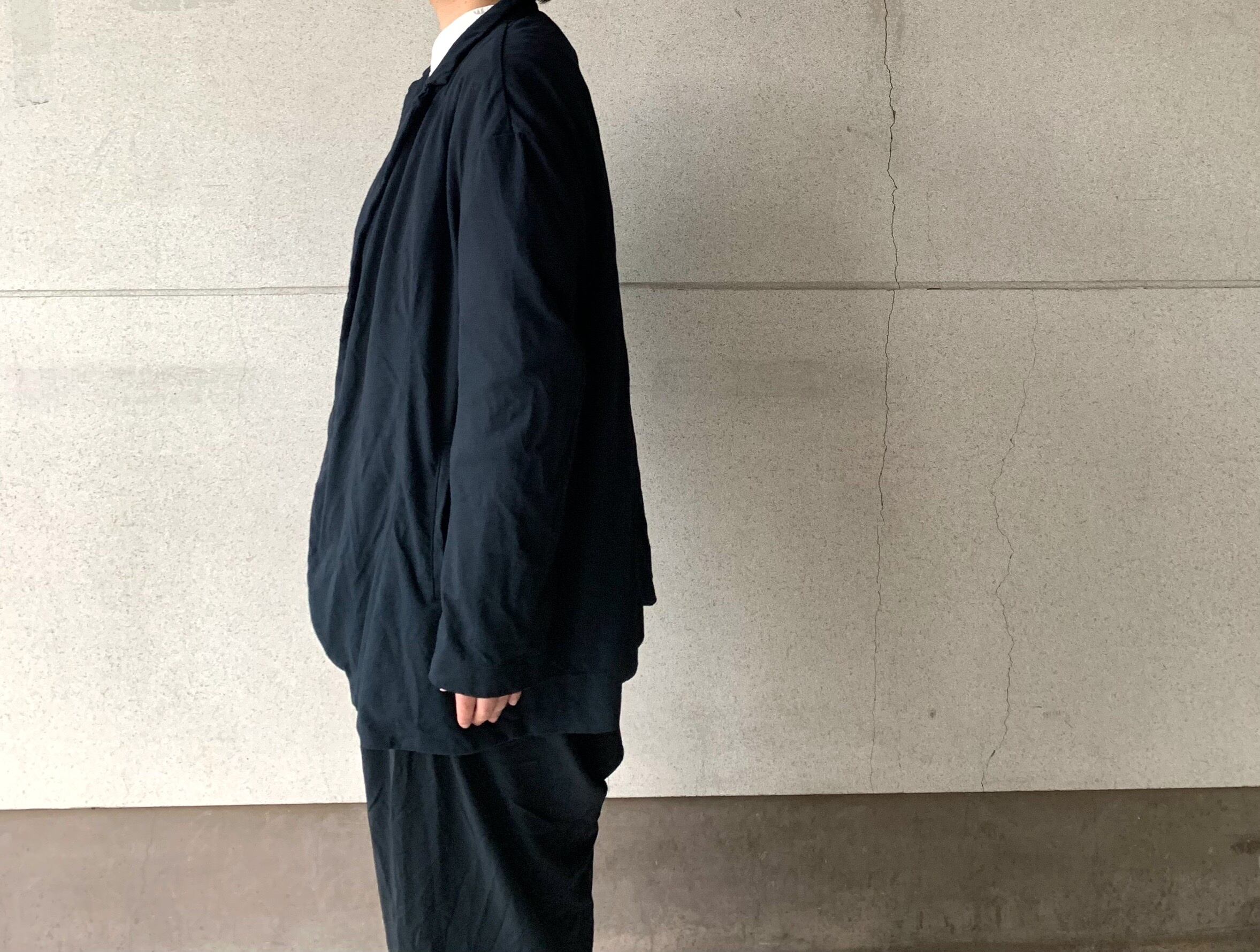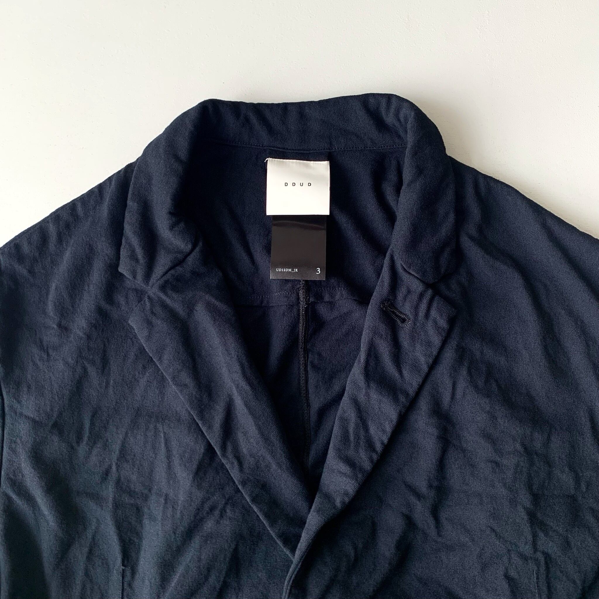 綿番でいうと20番単糸クラスのMVS精紡のスパンポリエステル糸で編んだ天竺編み生地を使用したジャケット。