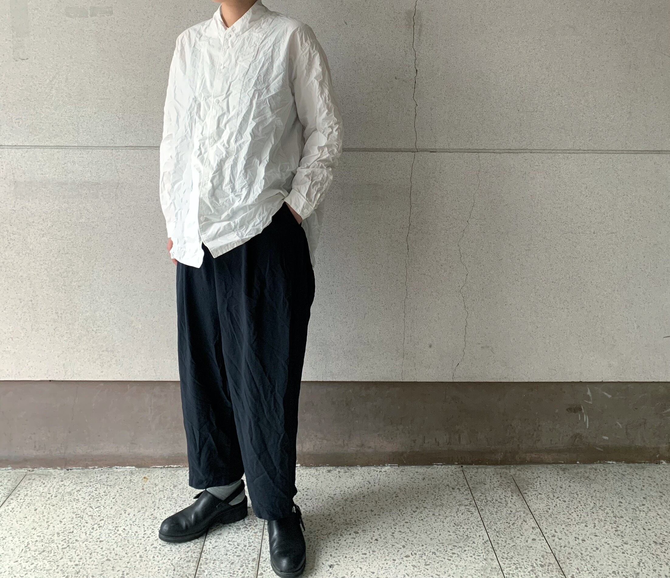 その生地を高圧高温で製品染め加工しシワ感と落ち感を共存させています。