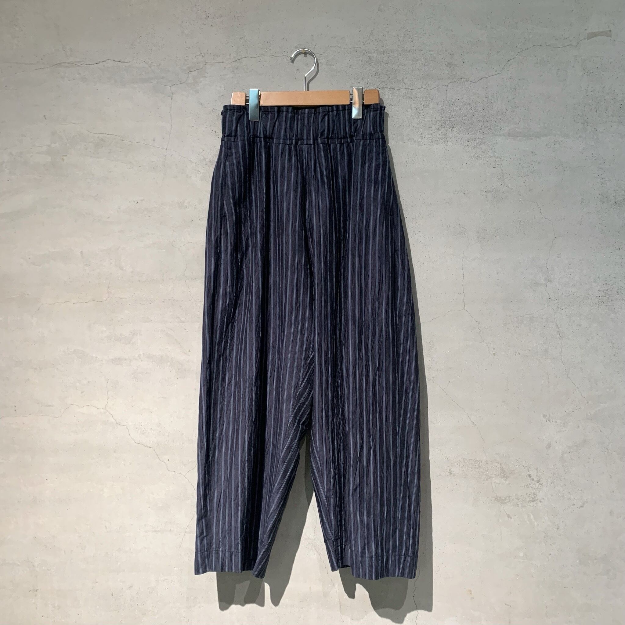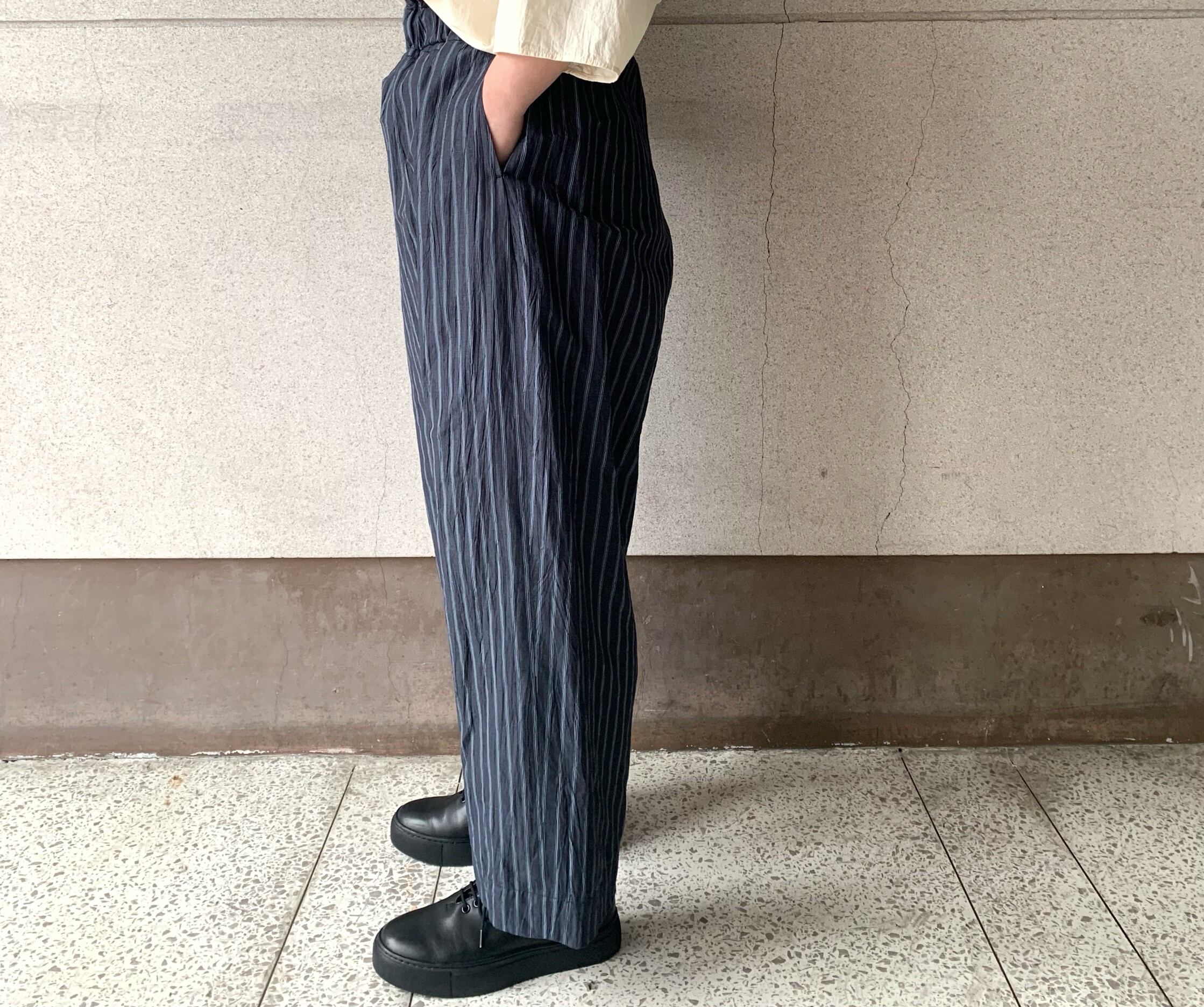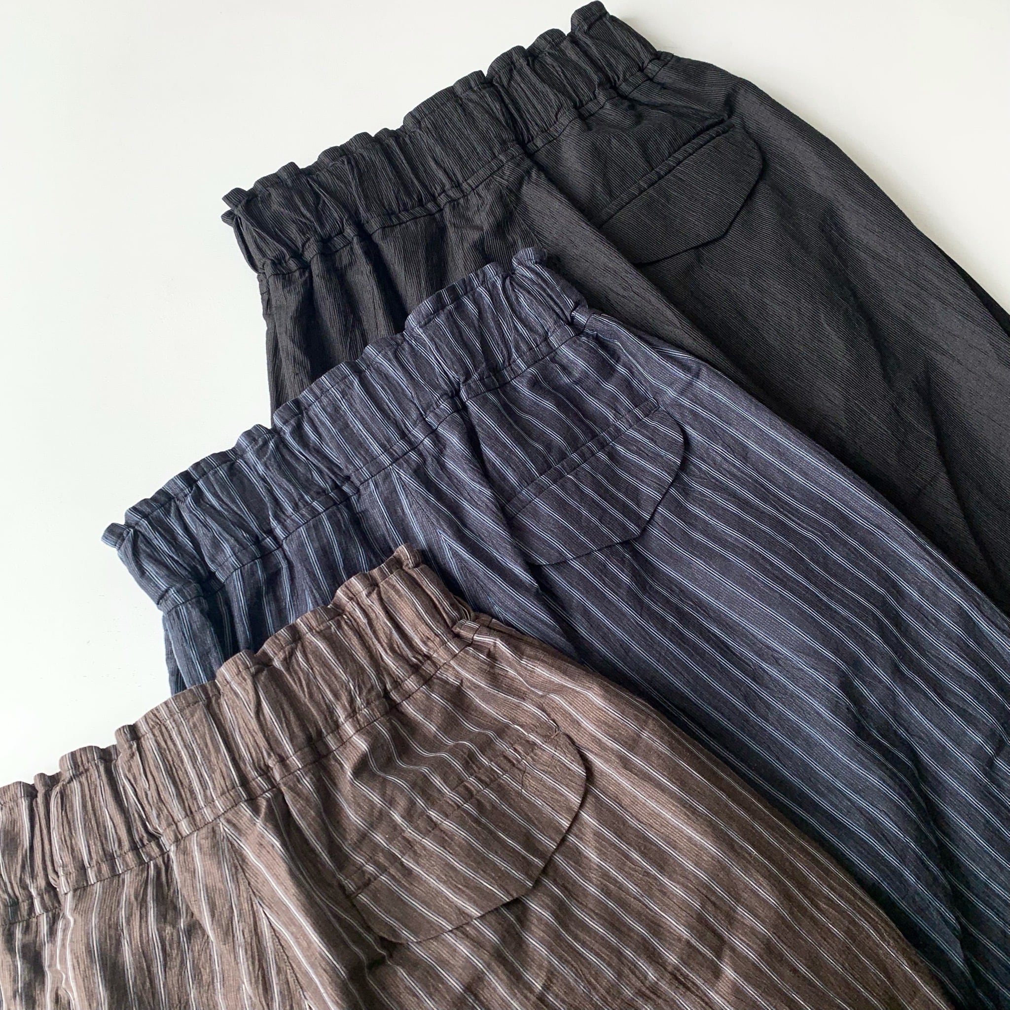 タテ糸にポリエステルの30dのポリエステル糸 ヨコ糸に異なる糸の先染めの1/60のリネンと80/2の綿糸を2本ずつ交互に配した平織生地を使用したパンツ。