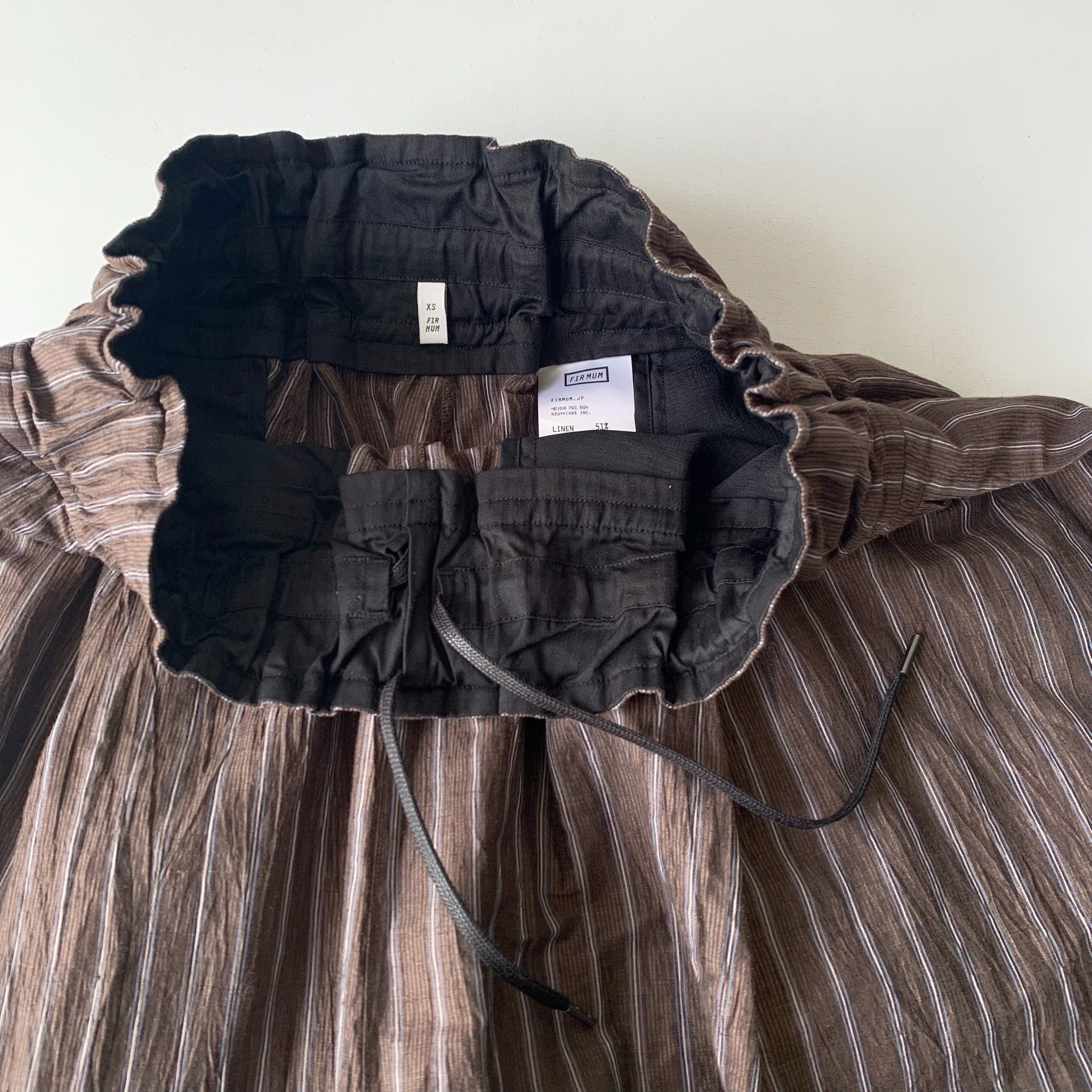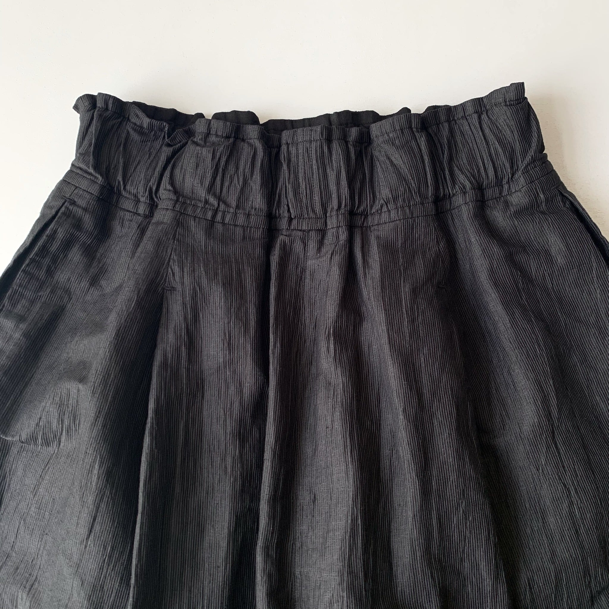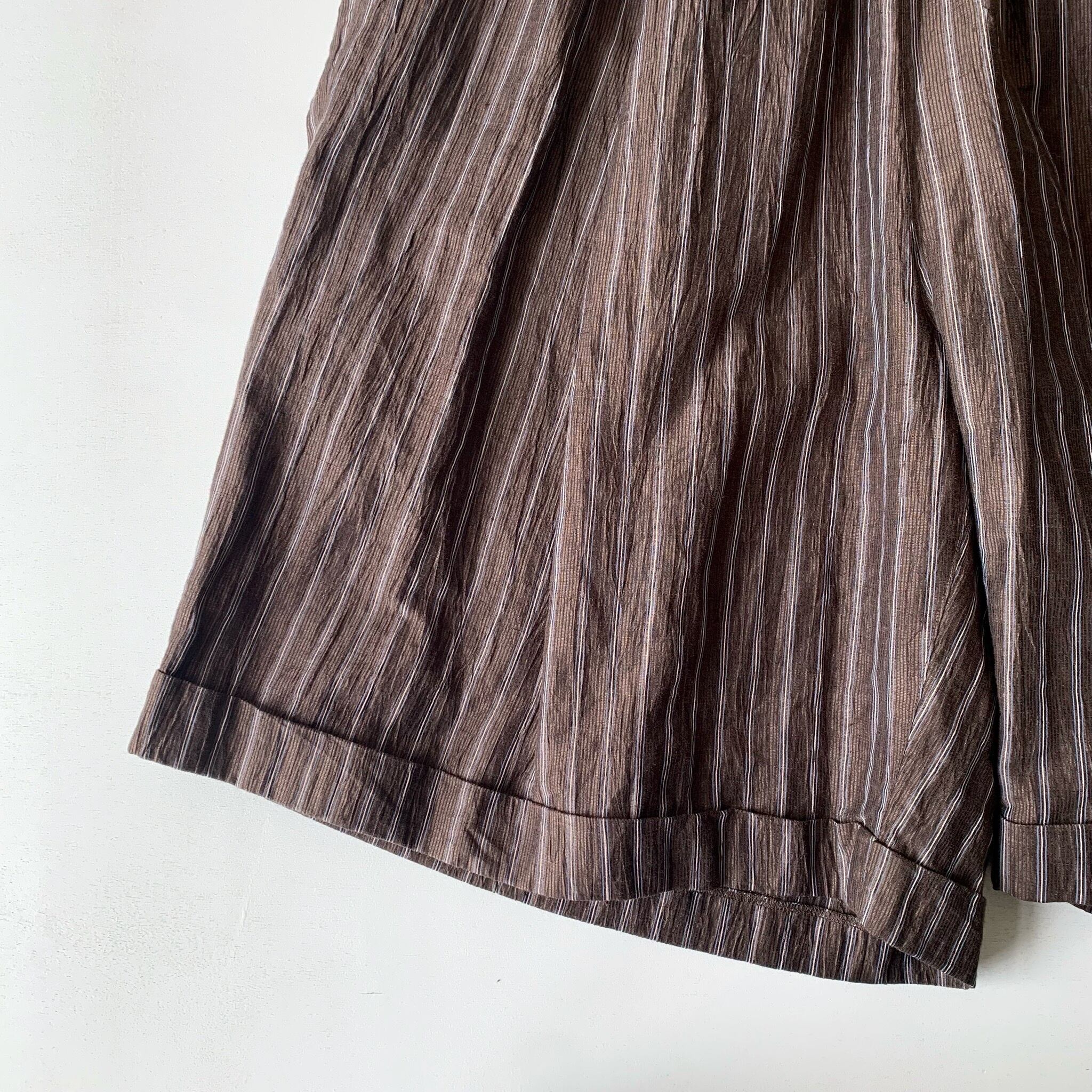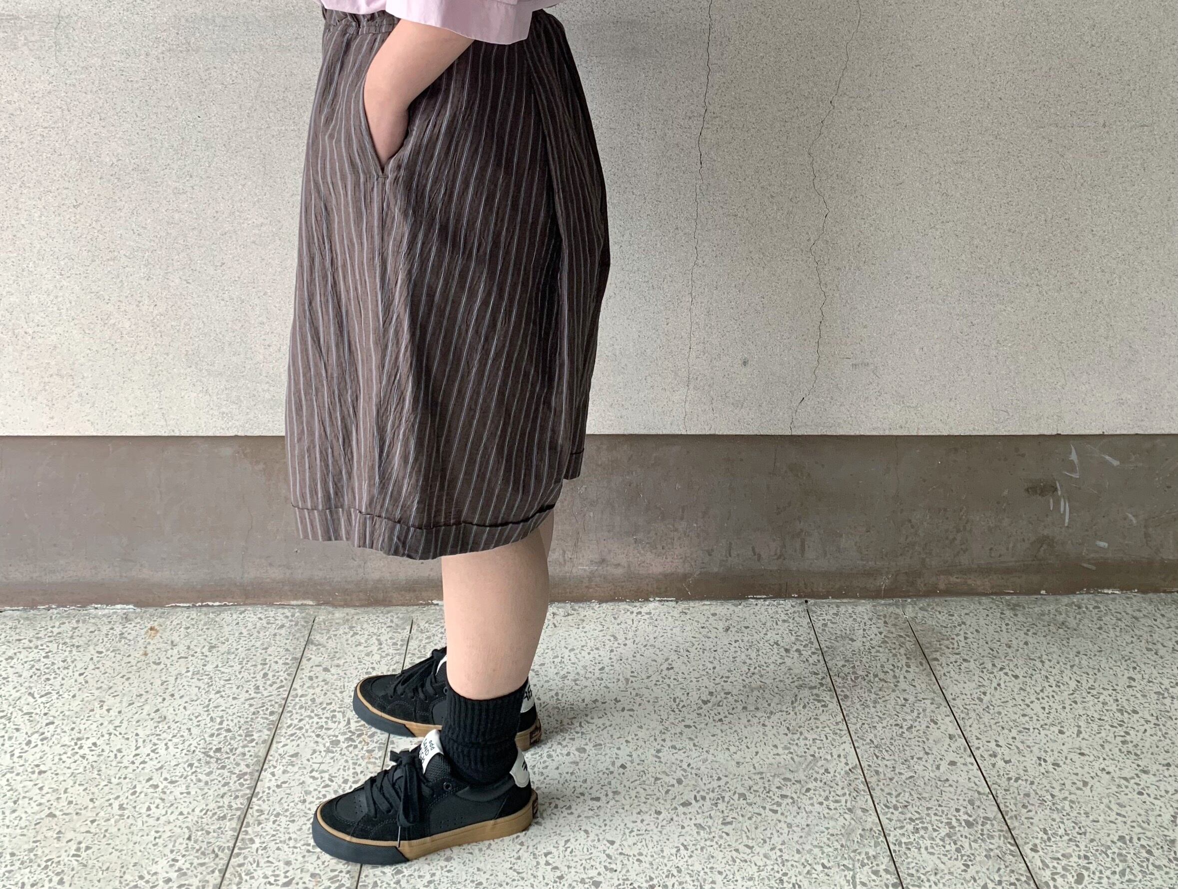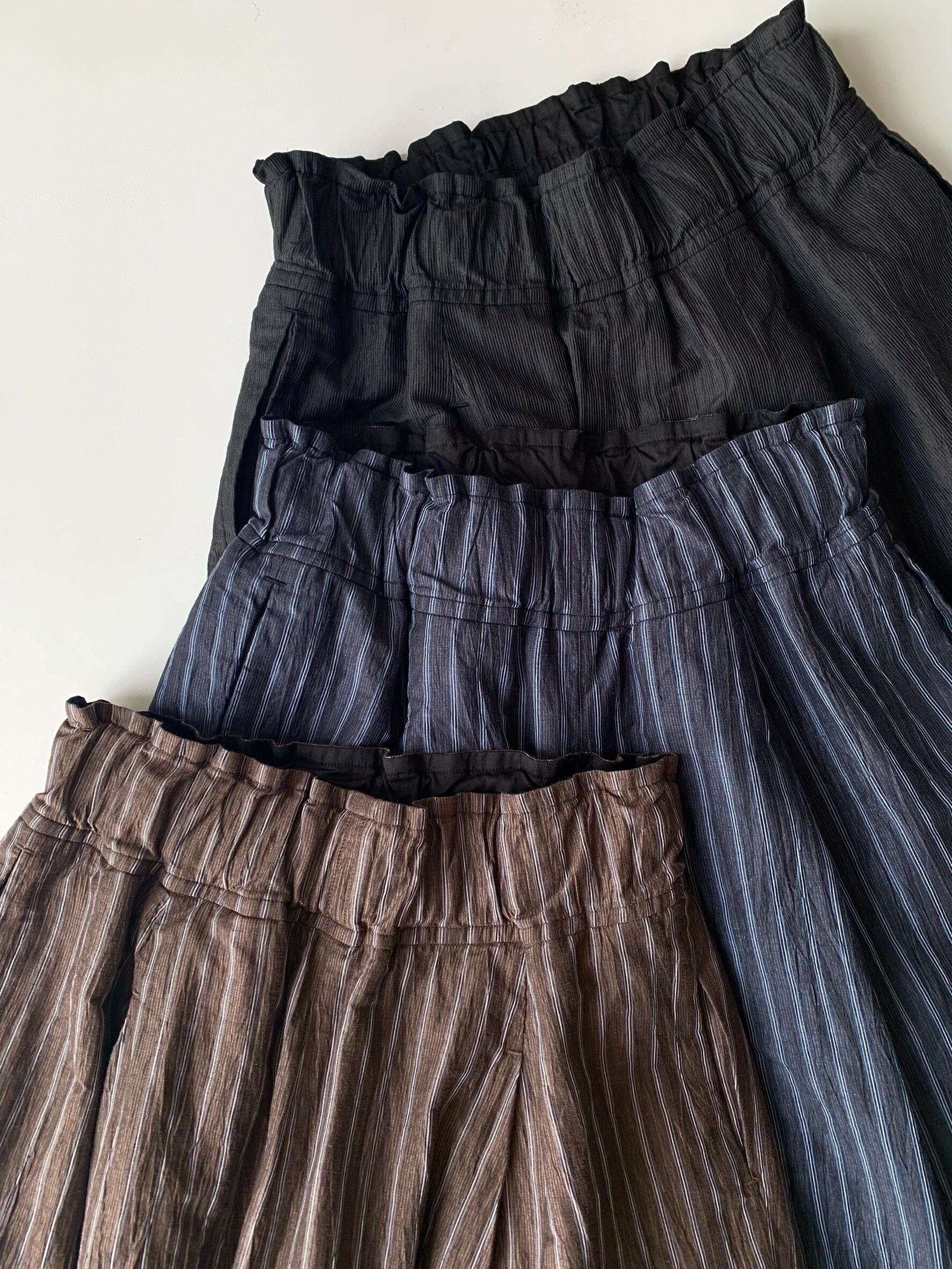 タテ糸にポリエステルの30dのポリエステル糸 ヨコ糸に異なる糸の先染めの1/60のリネンと80/2の綿糸を2本ずつ交互に配した平織生地を使用したパンツ。