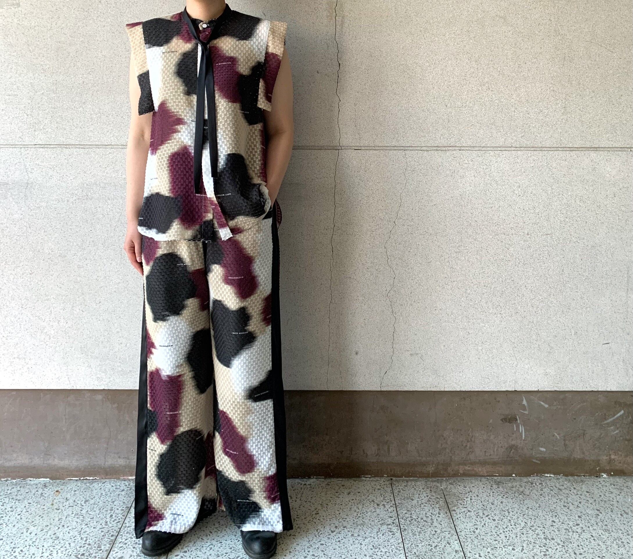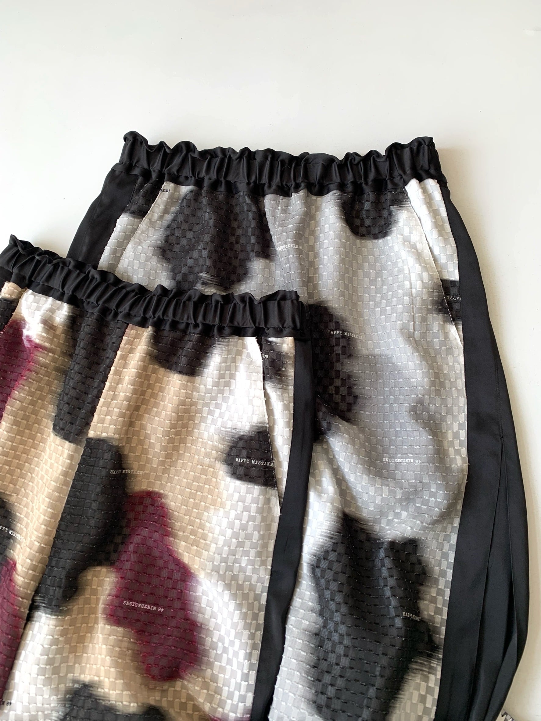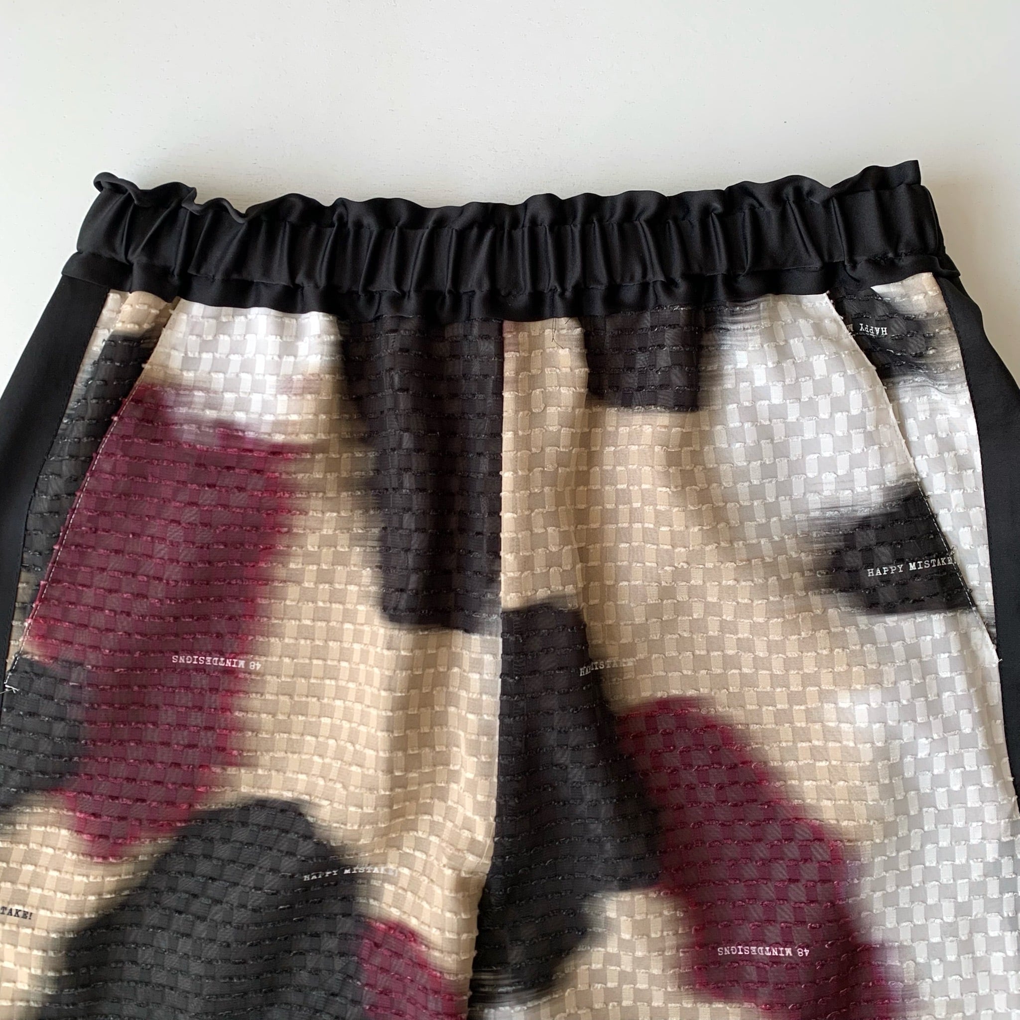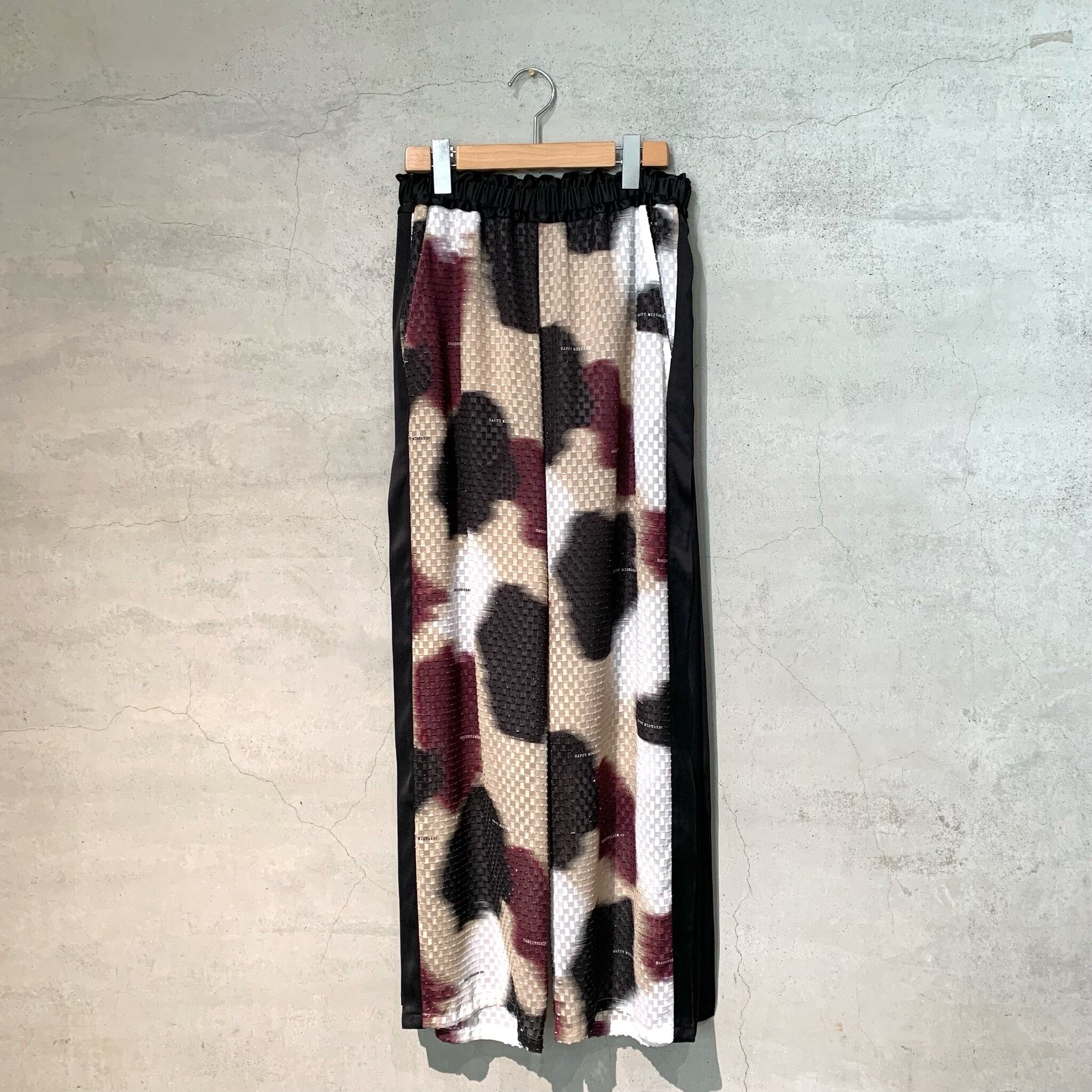 華やかさのあるテキスタイルをデイリーに楽しめるウエストゴムのパンツに。