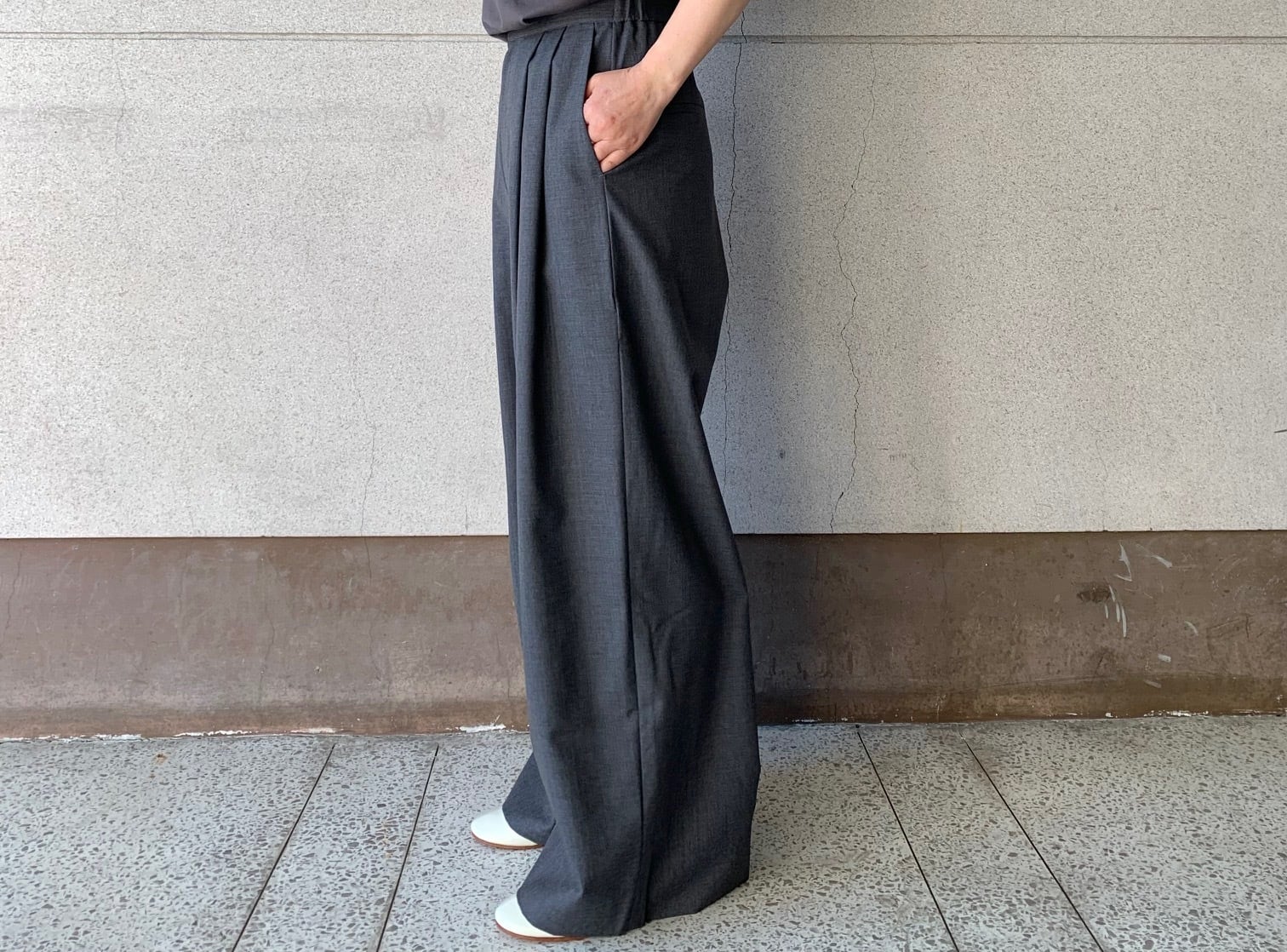 メンズのスーツライクなパンツですが、ウエストはゴム&紐仕様。
