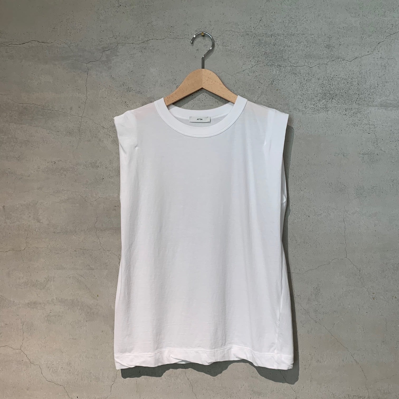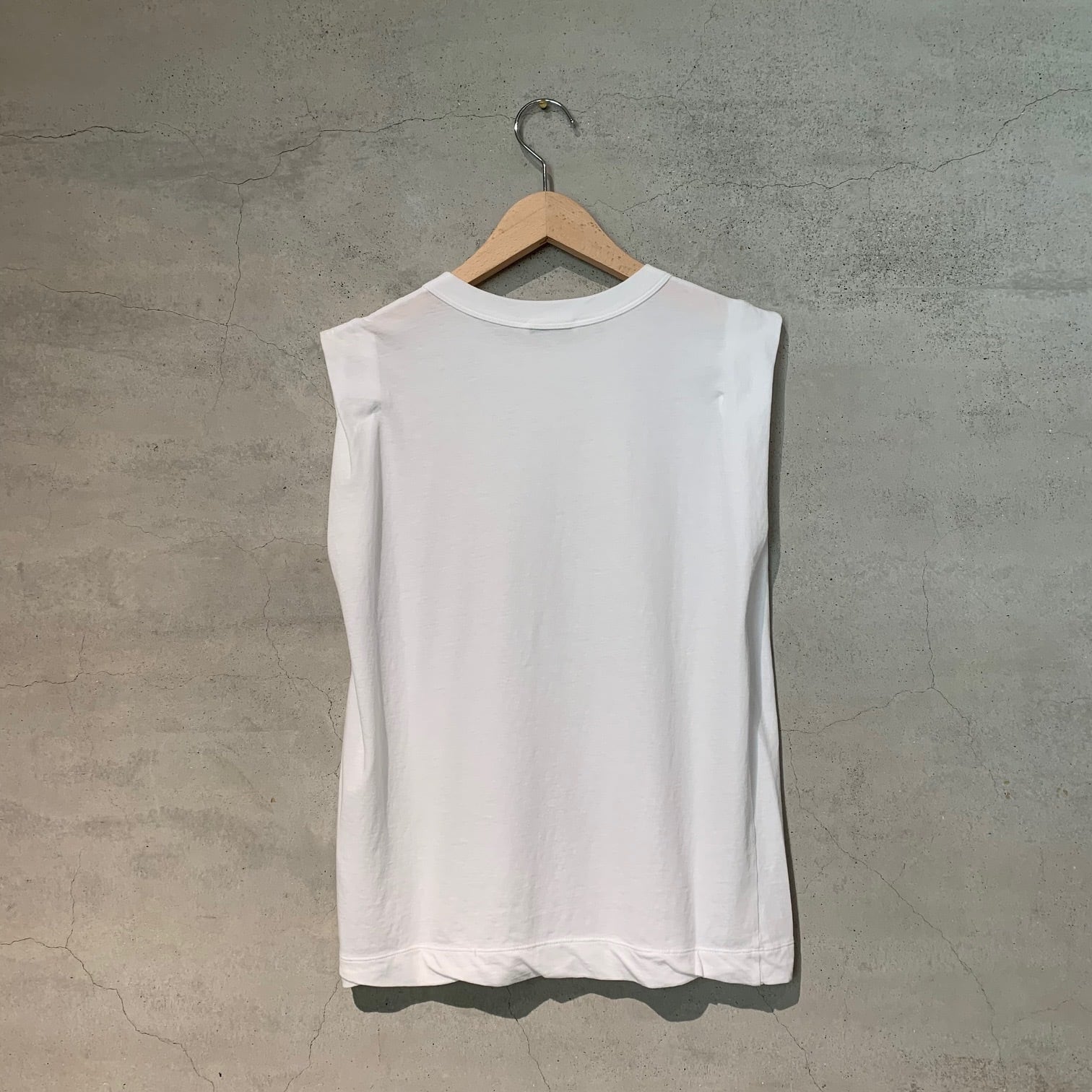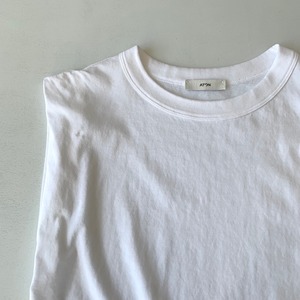 ゆとりのある身幅と太めのバインダー仕上げのスリーブレスカットソー。
